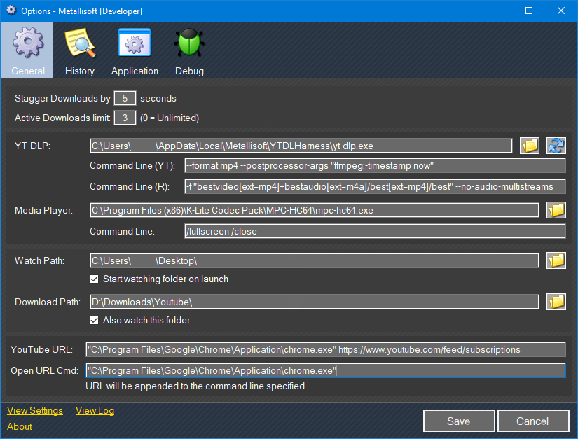 - User-modifiable command line arguments (See yt-dlp and ffmpeg documentation).